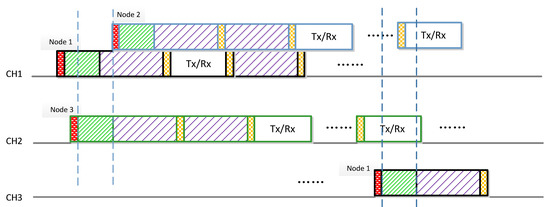 Furthermore, as the network does not need synchronization, the following scenario may occur as shown in Figure 3. Although node 1 and node 3 start channel allocation at different time slot, they will try to dwell on different channels to avoid interference, because their channel allocation periods overlap. However, node 2 starts channel allocation while the others two nodes (node 1 and node 3) finish the channel allocation. Since node 1 sleeps on CH1, node 2 considers CH1 as idle and thus dwells on CH1. Therefore, in order to avoid transmission collision, both node 1 and node 2 need to sense spectrum before transmission. If the channel is sensed busy, the node will continue to sleep until the channel is idle. Note that during the transmission period, nodes will not hop between channels, they will dwell on the allocated channel. When the next slotframe comes, they will hop again to achieve a collision-free channel allocation. For example, node 1 switches to an idle channel (e.g., CH3) to avoid interference with node 2 when the next channel allocation period arrives.