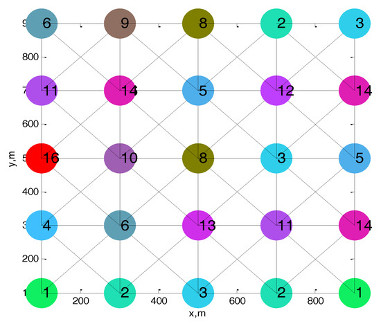 The simulation tool in this paper is MATLAB 2015b. We take the grid topology for example in the following simulations as shown in Figure 7 based on the typical application scenarios in IoT, the grid topology pattern include: (i) crops monitoring in farmland; (ii) facilities’ states monitoring for safety; (iii) monitoring of water surface; and (iv) fire or animal monitoring in grassland [31]. Moreover, our proposed solution can also apply in random topology. We use grid-topology network rather than random network, because under the grid-topology network, we can intentionally control the interference among nodes, especially when new nodes entering the network, and therefore we can better evaluate the performance of our proposed scheme under different scenarios. We assume that the number of available channels is 16. The attributes of each channel is set as shown in the Table 2, the transmission power is allocated based on [11], thus the channel condition of each node is different. The interference range is 600 m. The dotted-lines connecting the nodes represent two nodes within the interference range, and the number on the node represents the dwelling channel of node. The node in the center will be interfered with 20 nodes at most with the increase in the density. Figure 7 shows that the heuristic algorithm can achieve collision-free channel allocation.
