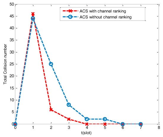 The convergence property can be observed when the network obtains a collision-free channel allocation. In research [32], each node’s ACS is randomly oriented without the channel condition ranking. As each channel is identical, the node has the same probability to stay on the current channel or randomly switch to another channel once collision occurs. In Figure 8, the network topology is made up of 50 nodes, and the channel allocation is combined with channel ranking to make a significant difference in the convergence time when contrasted with ACS irrespective of channel ranking. ACS combined with channel ranking only needs 4 slots to finish the channel allocation of 46 collision nodes, while ACS without channel ranking needs 6 slots to finish the channel allocation of 44 collision nodes. The former one has fast convergence property as the rd of the channel is to act as a guide to make a distinction so that the nodes are more likely to be allocated with different channels.