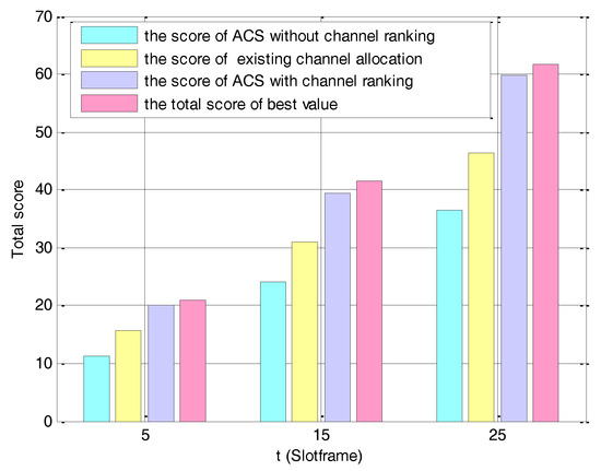 We calculate the score under different slotframes with another 25 nodes join the network in slotframe 15th and 25th as shown in Figure 9. The score of the ACS with the channel ranking is apparently higher than existing works [32,33]. This is because that existing works simply classify the channels into two categories, i.e., good channels and poor channels, and then randomly allocate the good channels to the nodes. Thus, the nodes can only use channel with relative good quality instead of the most ideal channel. The score of the ACS with the channel ranking is sufficiently close to the total score of the best value, which means that this algorithm allows allocating nodes to the most ideal channel for the greatest level.