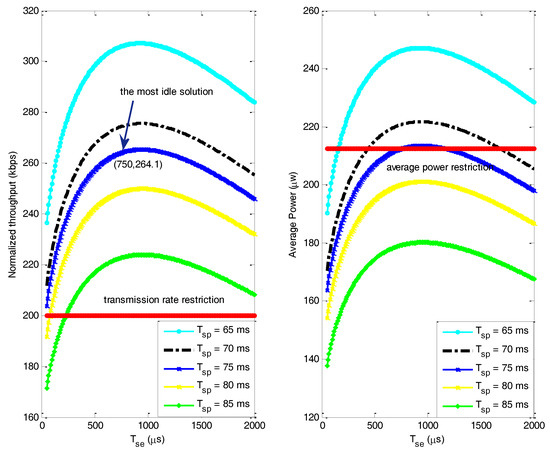 Figure 10 shows the normalized throughput under different spectrum sensing time and sleeping time and presents a combination of spectrum time and sleeping time which maximizes the normalized throughput while satisfying the power constraint separately. The left and right red line in Figure 10 represents the constraint of the normalized throughput and the power separately. The normalized throughput should be no less than the constraint and the consumption power should be no more than the constraint. We can observe that the normalized throughput increases before spectrum sensing time reaches the peak and then decreases. Therefore, the most ideal solution is when and , the maximum average transmission rate can reach 264.1 kbps. The simulation result also validates the feasibility of Algorithm 2.
