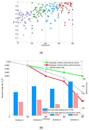 The main reason is that our solution can adapt to different channel condition. When the channel condition is worse during the slotframes 2–4 in Figure 12b, and results in the more transmission power, then the energy constraint will be set more stringent to prolong the lifetime of node. The optimal sleeping time and spectrum sensing time can guarantee the energy decreases steadily and it is dynamic during different slotframes as shown in Figure 12b. We can observe that the sleeping period has been extended to deal with the strict power constraint.