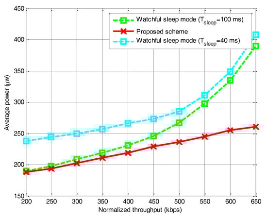 Then we evaluate the performance of average power consumption under different normalized throughput, and compare it with the Watchful Sleep mode in Figure 13. We first performed simulations for and , in accordance with and based on [35]. With lower traffic arrival rate, the Watchful Sleep mode with longer sleep period indeed decreases the average power consumption. However, with the increase of traffic arrival rate, the average power increases sharply. On the other hand, in our proposed scheme, the sleeping time and spectrum sensing time are adaptive and always keep the optimal values, and therefore consume the least energy. We can conclude that the optimal solution can not only control the power consumption but also maximum the normalized throughput.