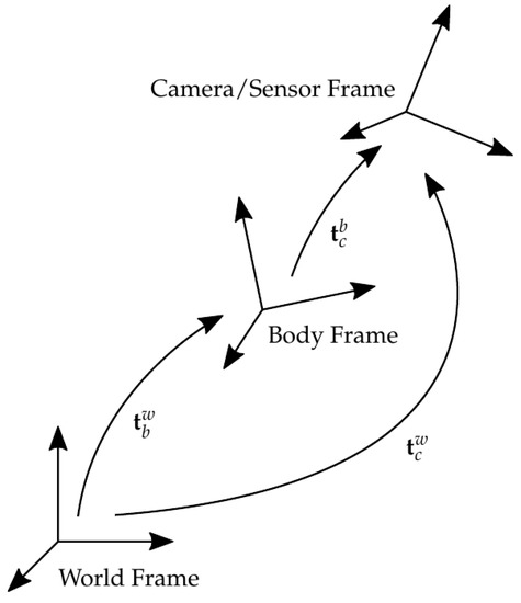 By splitting the world pose of the camera into a combination of the body pose and the camera relative pose , from Equation (2) can be shown as a function of the camera rotation and translation with respect to the body frame and , and platform body rotation and translation with respect to the world frame and :