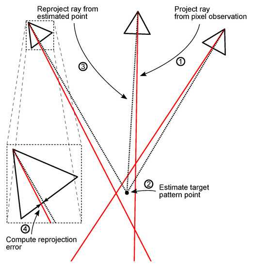 Unusually high reprojection errors were removed by an iterative process of outlier rejection. First optimisation was performed on all observations shown in Figure 5 for each platform. Reprojection errors, were calculated for each observation i of each pattern point k (see Equation (18)). These were then averaged per observation: