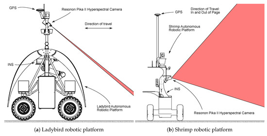 A line scanning hyperspectral camera was mounted to two different robotic platforms, Ladybird and Shrimp (Figure 3). Both were designed and built at the Australian Centre for Field Robotics (ACFR) at The University of Sydney as flexible tools to support a range of research applications [40,41,42,43,44,45]. The sensor suite on both platforms includes a real time kinematic (RTK)/global positioning system (GPS)/inertial