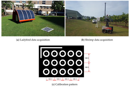 A calibration pattern with 15 points arranged in a 3 × 5 pattern was printed to an A1 size sheet of paper and mounted to a flat rigid plywood board (see Figure 4c). The pattern was designed to maximise contrast for efficient extraction of pattern points. A corner shape was added to one side of the pattern to facilitate unique identification of each point. It is not necessary to know the pattern’s dimensions for recovery of the platform to camera pose, as each point is treated independently during the calibration. This also means that theoretically a single point with sufficient observations could be used for calibration. However, we added more pattern points since there is no significant practical cost, efficiently increasing the amount of data obtained. For the Ladybird platform, the pattern board was placed on relatively flat ground (see Figure 4a). As shown in Figure 5, the pattern was scanned from several directions around a circle with the calibration pattern in the centre. Two types of scans were performed, one with the robot’s wheels flat on the ground and one with one side of the robot elevated by driving over an aluminium channel. This raised two of the wheels by approximately 100 mm, inducing a roll of approximately 4°. For the Shrimp platform, the same calibration pattern was mounted to a ladder in an approximately vertical orientation (see Figure 4b). In this case data were acquired next to a hill with various orientations and positions with respect the pattern, where the hill caused continuously variable roll and pitch, up to approx. 17° (see Figure 5b). For both platforms, body orientation was intentionally varied as much as possible in an attempt to maximise observability of parameters [33]. The robots were manually operated throughout the acquisition period, and care was taken to move slowly and smoothly while the calibration pattern was imaged.