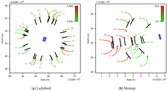 Top down view of platform positions (from navigation system) during each observation of the calibration pattern for Ladybird (a) and Shrimp (b). Each observation provides a complete view of all points on the calibration pattern, as well as concurrent navigation system solutions. The calibration pattern points are indicated with blue dots. The observation runs are numbered, and coloured according to the norm of vehicle body pitch and roll (i.e., ), as indicated by the colour bars in degrees. Note that in (b) the calibration pattern was upright (mounted to a ladder), which is why the points appear more closely clustered from the top-down perspective. Some of the observation runs appear very short in (b). This is because in these instances the platform scanned the pattern by rotating on the spot.