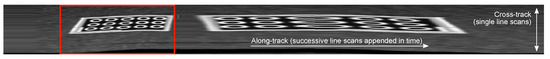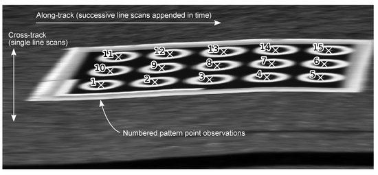 Approximate pixel locations of points on the calibration pattern were selected manually by appending successive line scans to form a rectangular image and selecting individual pattern points in order (see Figure 6 and Figure 7). Note that line scans were concatenated naively, ignoring camera or body pose data (i.e., not mapped or georeferenced). This worked well for this purpose, because the platforms were moved slowly and smoothly while the calibration pattern was scanned. Particular care was taken to ensure that point ID numbers were consistent for all observations of the calibration pattern. Pixel locations were then refined to sub pixel precision by extracting a patch around the selected points and resizing it to pixels using bi-cubic interpolation. The intensity peak closest to the centre was taken as the pattern point pixel location. Along-track, the closest time stamp was used to obtain the corresponding navigation solution. This provides pixel position and platform pose , which are necessary for calibration according to Equation (22).