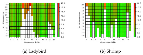 The number of observations affects the number of computations and therefore has a significant effect on calibration and MCMC run time. For Ladybird, optimisation and MCMC took approx. 15 min and 7 h respectively for all 25 observations. For 16 observations, this was reduced to just over 7 min and 4 h. For Shrimp, the respective optimisation and MCMC times were reduced from approx. 5.5 min and 5 h for all 20 observations to just over 2 min and 3 h with 14 observations.