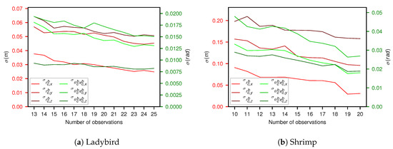 The results show that it is necessary to examine reprojection errors and remove outliers, as is common with many camera calibration approaches. Outliers statistically fall outside the assumptions encoded in their respective error models, and so the mean of the final camera pose distribution is pulled in the wrong direction. A number of observations for both platforms exhibited high reprojection errors relative to other observations (>approx. 8 pixels). These errors could be caused by manual labelling inaccuracies (e.g., due to limited resolution), navigation system solution errors that incorrectly fall outside the reported navigation uncertainty, or a combination thereof. Removing outliers had significant effects on the results, evident particularly in the correction of some parameters such as the z-offset for both platforms (see Table 3). The results shown in Figure 8 also support the iterative removal of outliers at each stage. For instance, reprojection errors of Ladybird observation 20 improve as other observations are removed, while Shrimp observation 4 degrades, and was eventually removed. Conversely, as shown in Figure 9 a larger number of observations, outliers or not, allows for greater certainty in the final result. Thus, there are two competing factors when performing outlier rejection. A sufficiently large number of observations is required to maintain an acceptable level of certainty, yet removing outliers is important to minimise reprojection errors. It is, therefore, desirable to obtain a sufficient number of observations to allow for subsequent outlier removal. The additional computational time required when increasing the number of observations is also a consideration. The ending condition threshold should be chosen such that significant outliers are removed, but a sufficient number of observations remain. In this paper a value of 5 pixels was empirically determined as an appropriately balanced threshold given the data.