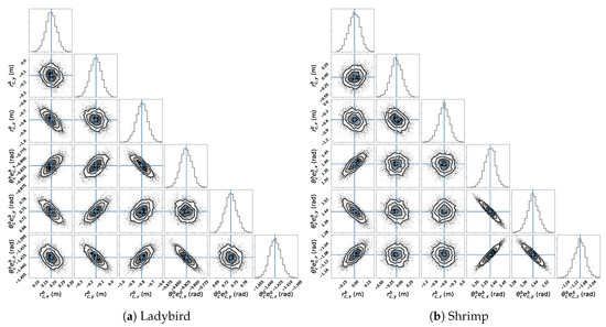Corner plots for (a) Ladybird and (b) Shrimp platforms for 16 and 14 observations respectively. Each sub-plot below the diagonal provides a 2D histogram of MCMC sample values for a pair of relative camera pose parameters. The sub-plots on the diagonal show 1D histograms for each parameter.