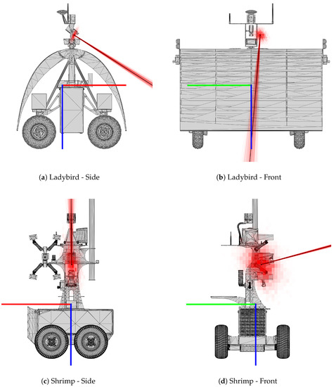 In Figure 12, the distributions of MCMC samples is shown superimposed on the corresponding platform model. Translation parameters are presented as a 2D histogram, similar to Figure 10, demonstrating the marginal density of the likelihood distribution from each orthogonal viewpoint. To present the orientation parameter distribution, line segments coincident with the camera’s viewing direction, and anchored to the optimized camera centre, are rotated by each MCMC rotation sample. Each line is semi-transparent, and so as all samples build up, the density distribution of the camera orientation is visualised. It is evident that there is greater variance in the MCMC samples for Shrimp when compared to the Ladybird platform, particularly for the translation parameters, as corroborated by the numerical results in Table 3.