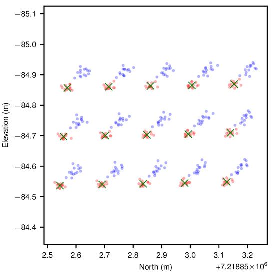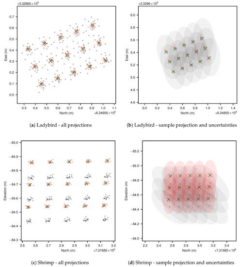 Figure 13 shows Ladybird’s and Shrimp’s observations, after outlier removal, projected to the best fit plane of predicted point locations before and after calibration (see Section 3.6). Figure 13a,c give projections of all observations, while Figure 13b,d only show the projections for one observation, but include uncertainty ellipses. Post calibration average pattern point estimates are also shown as green crosses.