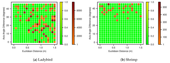Basins of attractions for the (a) Ladybird and (b) Shrimp platforms. The x and y axes of the plots are the Euclidean distances and axis-angle rotational differences between the initial values and the optimal reference solution respectively. Each grid cell is colour coded into two tiers based on the Mahalanobis distance of the result to the known optimum: below 0.1 and above, which was chosen as a suitable threshold for optimisation success.