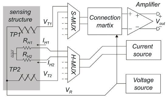 A simplified diagram of the SoC is shown in Figure 1. All electronic blocks are controlled by digital codes that can be set by means of an SPI (Serial Peripheral Interface) communication line in order to implement different functions. The digital subset is not shown in Figure 1 for simplicity. The sensing structure is based on the differential heat-transfer principle [] and is formed by two resistive heaters (p-polysilicon resistors, RH1 and RH2 in the figure, 2 kΩ each) placed between two thermopiles formed by ten p-poly/n-poly thermocouples (TP1 and TP2). The total thermopile sensitivity is 4 mV/K. All the four elements are suspended on independent silicon dioxide membranes, so that heat transfer from the heaters to the thermopiles occurs mainly through the gas.