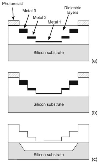 The chip has been designed with the BCD6s process of STMicroelectronics and a simple post-processing procedure has been applied in order to obtain suspended structures, which are thus thermally insulated from the substrate. The post-processing is aimed at selectively removing the dielectric layers from the front side of the chip and then opening a cavity in the substrate by means of anisotropic silicon etching. The dielectric layer removal is based on a novel technique that allows modulating the thickness of the suspended structures without adding lithographic steps. The technique, which represents an evolution of the techniques described in [], exploits the selectivity toward aluminum of fluorocarbon-based plasma etchings of SiO2. The metal layers of the IC (Integrated Circuit) fabrication process can be used to mask the etching locally, as schematically shown in Figure 3 for a three metal level process. The photoresist is used to mask the rest of the chip and to define areas where the complete stack of the dielectric layers should be preserved. After the plasma etching, the metal masks can be removed with a wet etch using the same photoresist layer of the dry etching as a mask. As a result, the dielectric stack thickness can be quantized into (N + 1) different levels in a process with N metal layers, using a single lithographic step. This feature is useful for the fabrication of MEMS microstructures where parts of different thicknesses are often required.