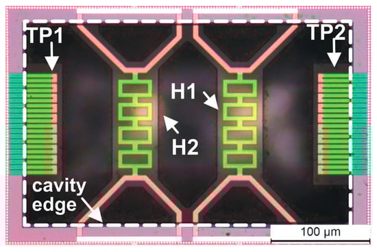 As far as the sensing structures proposed in this work are concerned, the heater membranes and the thermopile cantilever beams were defined using the Metal 2 layer, which represents a good trade-off between robustness and thermal insulation. Details about the post-processing procedure are reported in []. Briefly, a Reactive Ion Etching (RIE) in CF4/Ar (50%/50%) gas mixture with a RF power of 100 W was used to remove the dielectric layers using the Metal 2 layer to locally define the sensing structure geometry. An 8 μm thick photoresist film (MEGAPOSIT™ SPR™ 220-7.0) was used to broadly select the sensor area and protect the rest of the chip. After the RIE step, the metal mask was removed with a H3PO4–HNO3–CH3COOH water mixture at 45 °C using the photoresist layer as pad protection. Then photoresist was removed with acetone at room temperature and the silicon substrate was anisotropically etched for 150 min at 85 °C in a solution of 100 g of 5 wt % TMAH with 2.5 g of silicic acid and 0.7 g of ammonium persulfate. The sensing structure at the end of the post-processing is visible in the optical micrograph shown in Figure 4, where the main sensor elements are indicated.