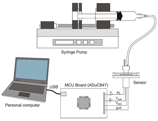 Air temperature was measured by means of a PT100 resistive probe. A simplified diagram of the experimental set-up is shown in Figure 5. The syringe pump was of reversible type, allowing air to be pumped or sucked into the sensor, depending on the direction of the stepping motor that controls the syringe piston. Syringes of two different diameters were used depending on the target volume. Connection between the sensor and the syringe is accomplished by means of a silicone pipe. The sensor is connected to a purposely-built printed circuit board, equipped with the ADuC847 micro-controller unit (MCU) of Analog Devices. The MCU controls the sensor settings through the serial program line (PL) and reads the analog voltages by means of the internal 24-bit ∆-∑ Analog-to-Digital converters (ADCs). The ADCs were programmed to provide a 40 sample/sec conversion rate. Due to the filtering properties of the ∆-∑ ADCs, the channel bandwidth was limited to 20 Hz, obtaining effective shaping of the output noise. The MCU board communicates with a personal computer via a USB interface. All the measurement process is controlled by a program running on the personal computer and written using the free Python multi-platform language. Numerical calculations are based on the Python “Numpy” module whereas the graphical user interface relies on the “PyQt4” porting of the “QT” C++ graphical libraries.