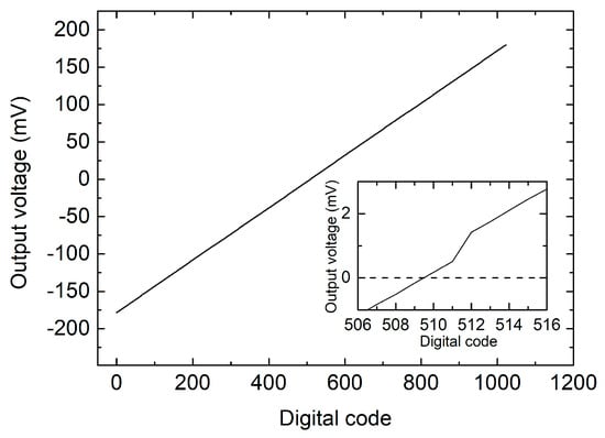 Output voltage as a function of the digital code that controls the differential component of the heater currents, properly trimmed to cancel the output offset.