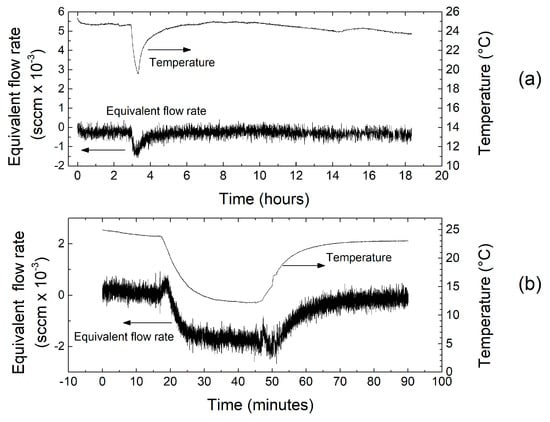 Recording of the output voltage, converted to an equivalent flow rate, across an 18 h interval (a) and a 90 min interval (b). During the shorter interval, a large temperature change is imposed.