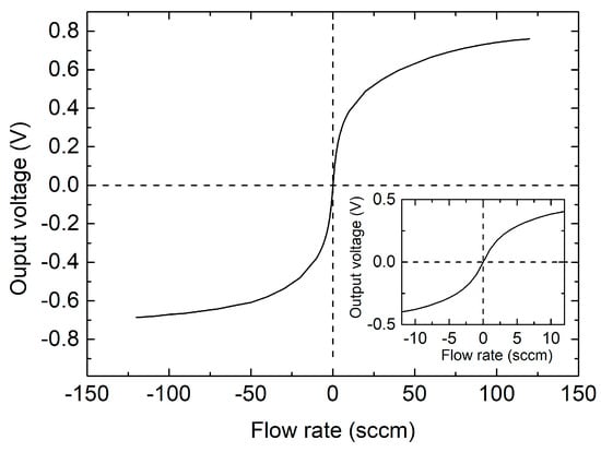 After offset calibration, the output voltage vs. flow rate characteristic was measured over the 0.1–120 sccm range. The result is presented in Figure 8, where the inset shows a magnification of the curve for small flow rates. Negative flows are obtained by swapping the gas inlet and outlet ports of the sensor. The curve presents a strong non-linearity, with a tendency to saturate, typical of sensors based on differential heat transfer [,]. This behavior has a negative impact on resolution, which can be identified with the peak-to-peak equivalent noise flow-rate, Qpp, given by
