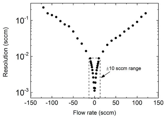 Sensor resolution as a function of flow rate. Resolution is reliably better than 10−2 sccm throughout the ±10 sccm interval, indicated by the dashed box.