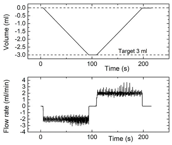 Instantaneous measured volume (top) and flow rate (bottom) for a measurement cycle obtained by programming the syringe pump for a 3 mL volume and 2 mL/min flow rate.