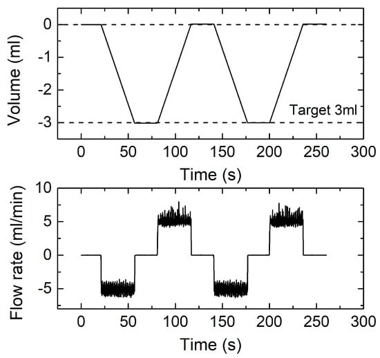 Instantaneous measured volume (top) and flow rate (bottom) for two successive measurement cycles obtained for 3 mL volume and 5 mL/min flow rate.