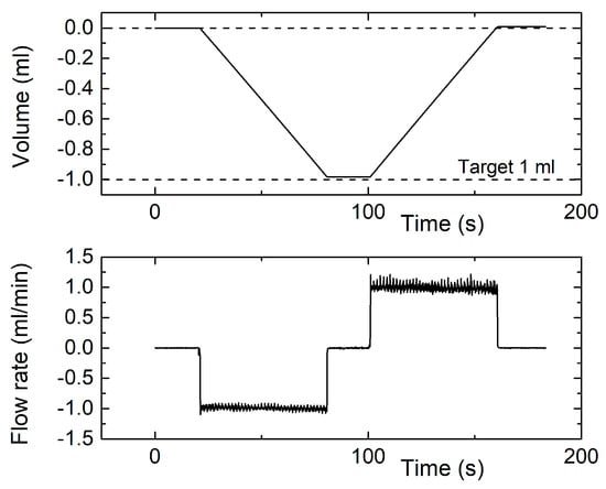 Instantaneous measured volume (top) and flow rate (bottom) for a measurement cycle obtained by programming the syringe pump for a 1 mL volume and 1 mL/min flow rate.