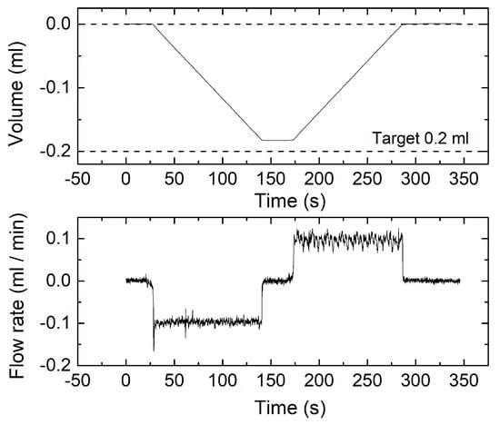 Instantaneous measured volume (top) and flow rate (bottom) for a measurement cycle obtained by programming the syringe pump for a 0.2 mL volume and 0.1 mL/min flow rate.