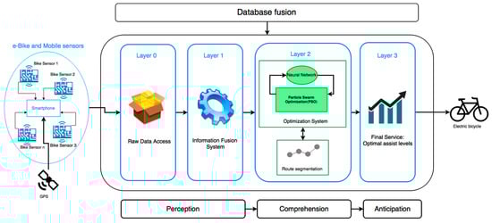 - Layer 2: In this layer, levels 2 to 4 from the JDL model for information fusion are integrated. The optimization mechanisms are implemented on the basis of the information merged in the previous layer. The optimization model incorporates information from segmented routes, geographic characteristics of the routes, previous consumption data, information from bicycle sensors, wearable devices and mobile sensors. As an output of the optimization models, assistance levels are proposed to the user according to the characteristics of the route travelled, the battery level and the physical strain of the user. The optimization is based on particle swarm (PSO), which is backed by a neural network in order to optimize several parameters in the routes.