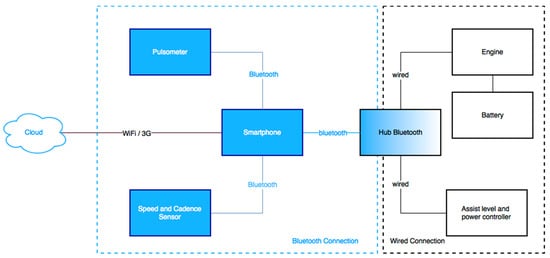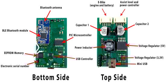 The information described above is provided by the engine, and together with the information from the battery, it is sent via data bus wiring to the Bluetooth hub. In Figure 3, the connection diagram of the different elements deployed in the sensor network can be seen. The purpose of the Bluetooth hub device is to send and receive data between the user’s smartphone and the electric bicycle. Figure 4 shows the device designed in this work, which can be integrated into a conventional e-bike as shown. Bluetooth 4.0 BLE (Bluetooth low energy) HC05 module sends all data to the user’s smartphone. These data arrive at the hub via two wired connections. In the first wired connection, the data for the engine and the battery of the bicycle are received. In the second connection, the assist level and power controller data sent by the handlebar controller are received. Orders are sent from this device for changing the level of assistance and turning the equipment on and off. It also has a PIC (programmable intelligent computer) microcontroller module responsible for performing computing operations. An EEPROM memory stores data and a driver chip DS28CM00 assures safety by providing a unique identifier to each of the devices. It also has a Mini USB (Universal Serial Bus) port to perform firmware updates of the device.