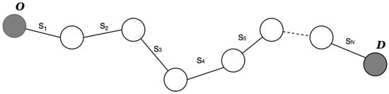 One of the first challenges encountered is the division of a route into independent segments connected to each other. The purpose of this division is to reduce the complexity of the problem by assigning an optimum level of assistance to each segment. As described in the introduction of this paper, electric bicycles are operated through a series of assist levels which correspond to the amount of power supplied by the engine. At a higher level of assistance, increased engine power will be obtained, causing higher energy consumption. The criterion for this division is based on the slope difference at the different points of the route. For each of the GPS points , knowing their slope data, it is possible to group the adjacent route points that have a slope magnitude similarity, in the same segment . These calculated segments may have different lengths. Then, a route is created with origin and destination which is divided into a number of segments connected with each other as shown in Figure 5.