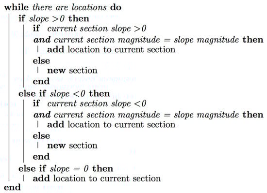 The higher the slope of the segment, the greater the user’s effort is to surmount it, and therefore, the higher the level of assistance required from the engine. The first approach of this algorithm groups the segments according to the sign of their points (positive or negative), considering only the sign of the slope of the previous point. However, the main disadvantage of this approach is that is does not provide a realistic representation of the route, since within a segment of a positive slope, for example, there may be segments that are steeper than others, thus it should not be only considered whether the slope is positive or negative. Magnitude must also be considered, hence, the slopes that are 0% are grouped as positive or negative depending on the adjacent slopes. The pseudocode of the second approach is shown in Figure 6.
