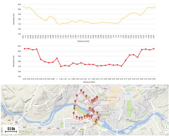 In Figure 7, the output of the algorithm for a 5 km route is shown. The first graph, with the yellow line, belongs to the route profile based on its altitude. In the second graph, we can see the different segments calculated by the algorithm. The red squares represent the starting points and the ending points of the different segments. At first glance, we can see that the segments which have been calculated correspond to the slope profile of the route. Finally, in the lower part we can see the different starting and ending points of the calculated segments shown on a Google map, the original path is represented with a red line.