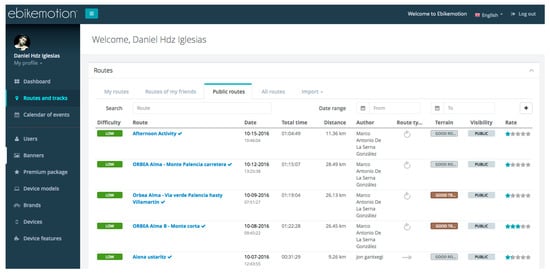 The mobile application registers the location data (GPS) together with all the data measured every 2.5 s by the sensors, thus, in the course of the study an average of 274 measurements were recorded for each user during the trip. The data storage and the subsequent analysis were performed on the remote server and a backend is provided to users, allowing them to view the results on the web. Figure 8 shows a screenshot of the web platform of the eBikeMotion project.
