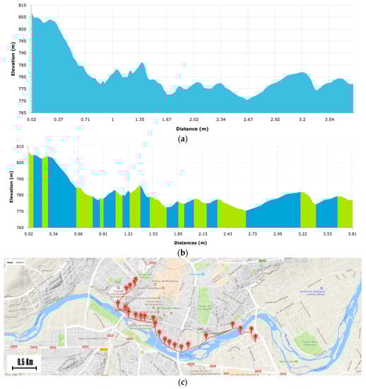 The first step of the process was to divide the route into different segments. Figure 9 shows the route profile Figure 9a and the division of the route into 23 segments (Figure 9b), which clearly match. Figure 9c shows how the calculated segments are corrected and adapted to the terrain.