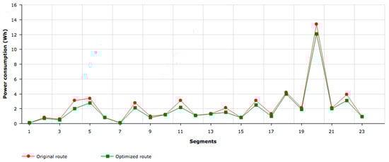 As can be seen in Table 6 and Table 7, the distance of the experimental route is almost the same as the optimized experimental route (3.82 km and 3.88km, respectively), since the route is the same. However, in the optimized route, the duration is somewhat higher (12.6 min as opposed to 11.3 min). This occurred because the global assist level was lower, and kept the user’s heartbeat virtually constant; therefore, we can say that the relationship between assistance and user effort was correct. As shown in Figure 11, consumption is significantly reduced (10.32%), which in turn increases battery range. A greater reduction in the consumption of energy was achieved in segments where greater power is demanded. The segments with a higher power demand are those with a higher slope. Since user experience was affected by an excessive increase in physical effort at these segments (maximum heart rate was constant), the result was significant energy savings with the same experienced user effort and with a similar travel time.