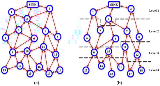 A typical example of a WSN topology in: (a) Initial arrangement of interconnected network nodes; (b) Level-based taxonomy of network nodes.