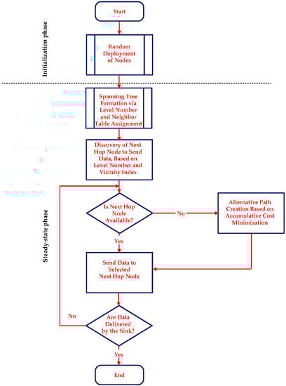 Additionally, the existence of the weighting factors in this cost function, aims to support the appropriate adaptation of the algorithm in order to satisfy the different demands of every individual application. For instance, wherever the conservation of energy has major priority, is assigned a greater value. In Figure 2, a descriptive flowchart of COALA protocol is illustrated.