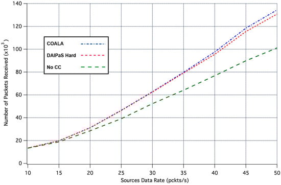 Next, the performance of COALA protocol is investigated relatively with how the data transmission is affected by the progressive rise of the of data traffic. This correlation is depicted in Figure 4 and Figure 5, through the graphical representation of the overall number of the data packets received and the percentage of the data packets lost respectively.