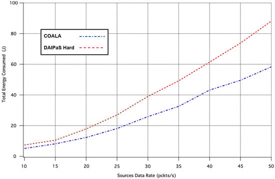 The examination of Figure 6 demonstrates that COALA protocol outperforms DAlPaS Hard in energy efficiency increasingly as the traffic load raises.