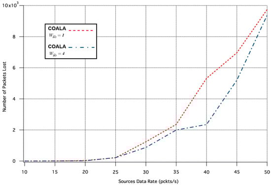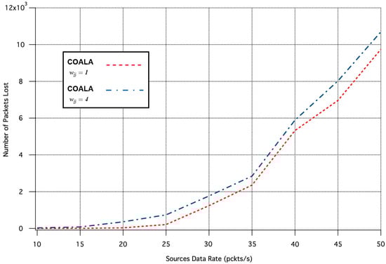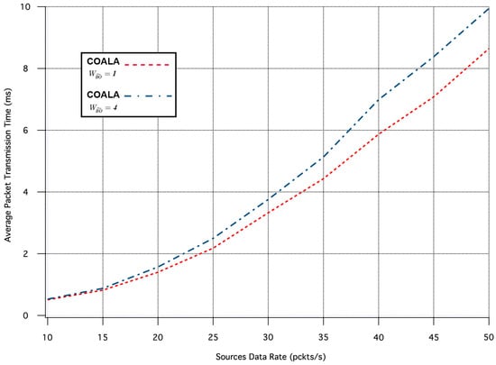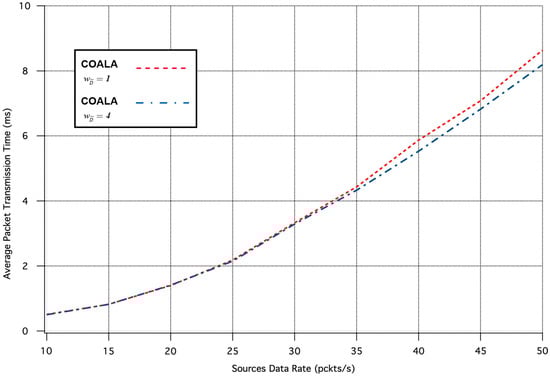 Finally, a set of simulation tests were performed in order to examine how the variation of the weighting factors of the accumulated cost of nodes deviates the results of COALA protocol utilization. As an example, the way by which the variation of two weighting factors, i.e., and influences the average packet transmission time and the number of lost packages was investigated.