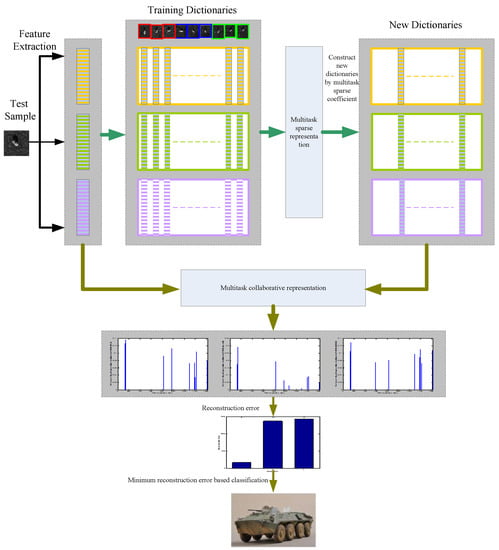 In recent years, the combination of multi-task learning and representation learning has become an important trend in pattern recognition. The idea behind multi-task learning is that when these tasks are similar enough or correlative to a certain extent, exploiting the correlation between them is beneficial for improving the generalization of recognition. Some research results have confirmed the advantages of multi-task learning [24]. Yan et al. extracted various types of features from images, and viewed each type’s sparse representation recognition as a task in order to model multi-feature joint sparse representation recognition as a multi-task sparse learning problem [25]. Fang et al. proposed a face-recognition method based on local Gabor feature adaptive multi-task sparse representation [26]. Li et al. proposed a hyperspectral image-classification method by combining multi-task learning with collaborative representation [27]. Luo et al. investigated a manifold regularized multi-task learning (MRMTL) algorithm, which can effectively control the model complexity and ensure that the functions in the shared hypothesis space are smooth along the data manifold [28]. Furthermore, Luo et al. proposed a novel large margin multi-modal multi-task feature extraction framework, which can not only handle correlated and noisy features but also utilize the complementarity of different modalities to reduce feature redundancy [29]. Both multi-task sparse representation and multi-task collaborative representation can exploit shared training sample patterns between different tasks to ensure that the correct training samples are selected, excluding interferential atoms. In addition, recently some SAR target-recognition technologies have been based on deep learning. Ding et al. developed the target-recognition algorithm combined with a data enhancement convolutional neural network [30]. Chen et al. investigated the application of deep convolution networks for SAR target recognition in detail [31].