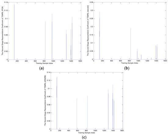 Figure 7. (a) The second-stage representation coefficient of principal component analysis (PCA) features of TSMRL; (b) the second-stage representation coefficient of wavelet features of TSMRL; (c) the second stage representation coefficient of 2DSZM features of TSMRL.