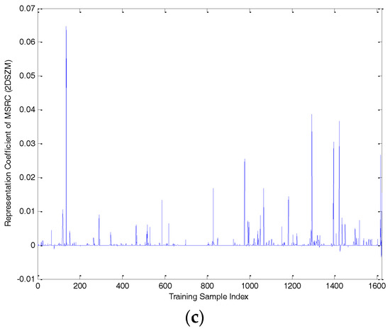 Figure 8. (a) Representation coefficient of PCA features of multi-task sparse representation classifier (MSRC); (b) representation coefficient of wavelet features of MSRC; (c) representation coefficient of 2DSZM features of MSRC.