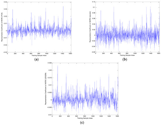 Figure 9. (a) Representation coefficient of PCA features of multi-task collaborative representation classifier (MCRC); (b) representation coefficient of wavelet features of MCRC; (c) representation coefficient of 2DSZM features of MCRC.