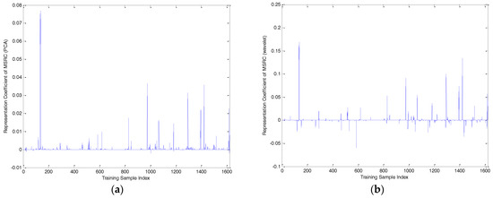 (a) Representation coefficient of PCA features of multi-task sparse representation classifier (MSRC); (b) representation coefficient of wavelet features of MSRC; (c) representation coefficient of 2DSZM features of MSRC.