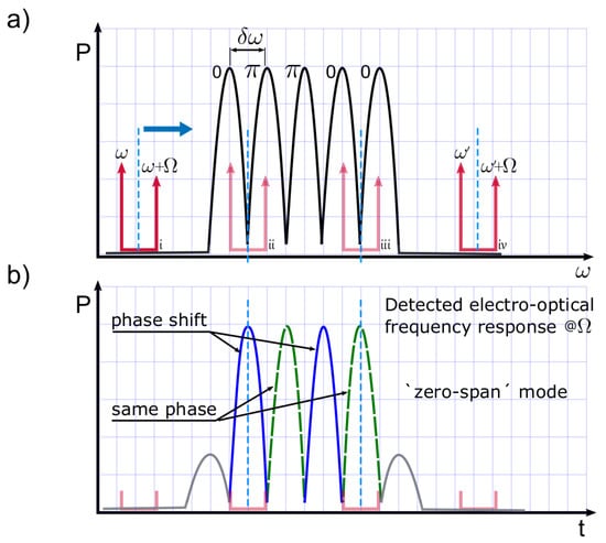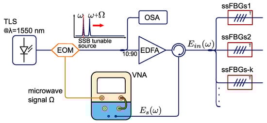 The interrogation method to retrieve the phase and amplitude response from the sensors (see Figure 3) is performed by means of a vectorial network analyzer (VNA), which is used to measure the sensing network scattering parameter at a fixed microwave frequency (). In this way, the complete electro-optical frequency response from the system is obtained at the modulation frequency. This is known as a ‘zero-span’ mode measurement, meaning that the power of the sensing network frequency response is displayed versus time, at the fixed frequency. When we set this frequency to be , the network frequency response is determined by the direct and cross terms, which are determined by the phase relationship between adjacent sub-bands of the K sensors present in the network ().
